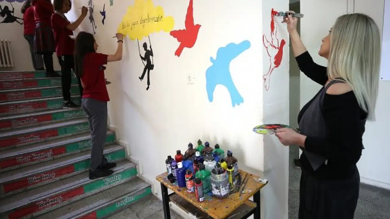 4 Temmuz Ortaokulunda görsel sanatlar öğretmeni Aslıhan Yurtoğlu ile fırça ve paletle buluşturduğu öğrencileri, Mustafa Kemal Atatürk, Mehmet Akif Ersoy, İbni Sina, Kemal Sunal, Adile Naşit, Neşet Ertaş ve Necip Fazıl Kısakürek gibi isimlerin resimlerini sınıf ve koridor duvarlarına çiziyor.