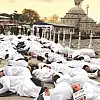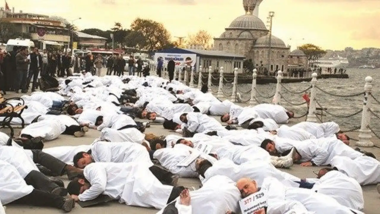 Protesto eyleminde bir kişi, sahilde kurulan darağacında Mısır üniformalı asker tarafından temsili olarak idam edilirken, infazı izleyen kefen giymiş 528 kişi de aynı anda yere düştü. Bir süre sonra ayağa kalkan bu kişiler, hep bir ağızdan 'Öldük sandınız, ölen insanlığınız ve herkes dirilecek' şeklinde slogan attı. Sahildeki vatandaşlar da Rabia işareti yaparak protestocu gruba destek verdi.