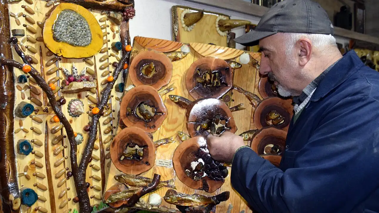 Van'ın Erciş ilçesinde Sami Demir (65), çöp ve atık malzemeler ile Van Gölü'nde çekilmenin yaşandığı bölgelerde toplayıp kuruttuğu ölü inci kefaliyle birbirinden güzel tablolar yapıyor. Çevre bilincine dikkat çekmek istediğini belirten Demir, bu şekilde 600'e yakın tablo ve biblolarını evinde ve atölyesinde sergilediğini söyledi.