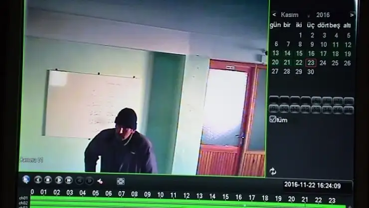 Caminin güvenlik kameralarında ise; hırsızın camiye girişi yer alıyor. Daha sonra kabloyu kesen hırsızın yardım kasasının bulunduğu alana gitmesi ve bir süre sonra da camiden ayrılması kameralara takılıyor.