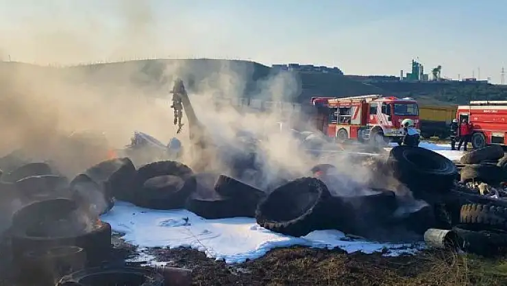 Kocaeli'nin Gebze ilçesinde onlarca iş makinesi lastiği alev alev yandı. Yangın ekiplerin yoğun çabalarının ardından kontrol altına alınarak söndürüldü.
