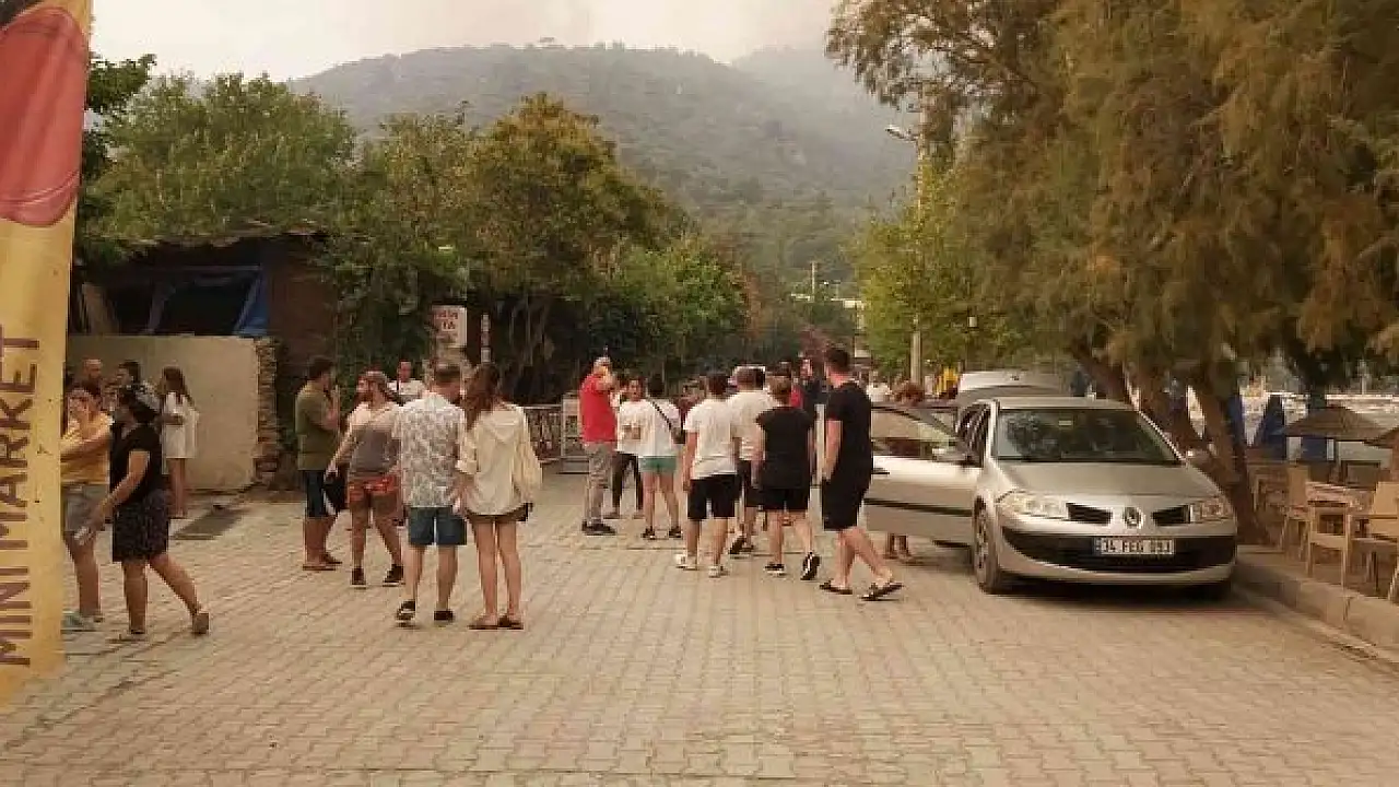 Muğla'nın Datça ilçesinde çıkan orman yangını yerleşim alanlarını da tehdit etmeye başlayınca Hayıtbükü koyundaki vatandaşlar ekipler tarafından güvenli bölgelere sevk edilmeye başladı.