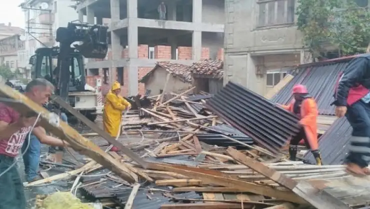 Çorum'un İskilip ilçesinde etkili olan fırtına çatıları uçurdu, ağaçları devirdi.