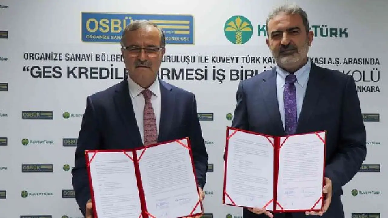 Organize Sanayi Bölgeleri Üst Kuruluşu (OSBÜK) ile Kuveyt Türk Katılım Bankası arasında, Organize Sanayi Bölgelerinin (OSB) ve katılımcılarının çatı güneş enerjisi santrali yatırımlarına uygun finansman imkânı sağlayacak 'Güneş Enerjisi Santrali (GES) Kredilendirmesi İş Birliği' protokolü imzalandı.
