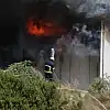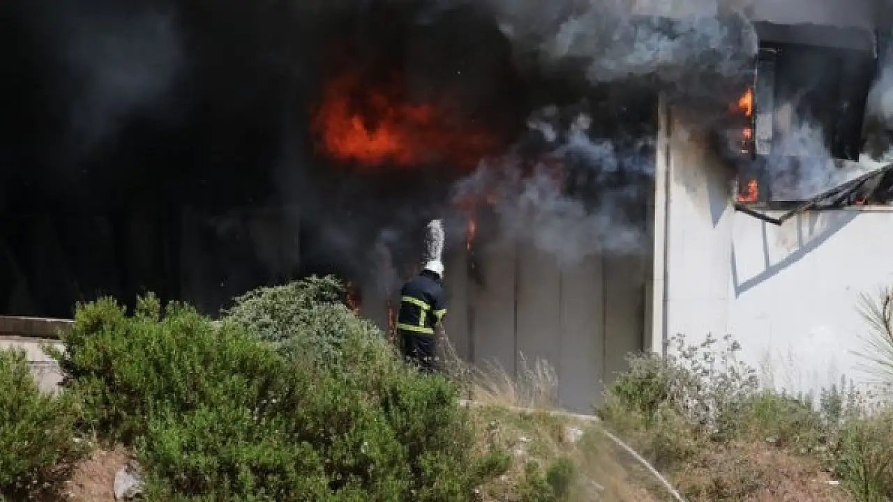Polis ekiplerinin tesis çevresinde güvenlik önlemi aldığı yangına itfaiye müdahale ediyor.