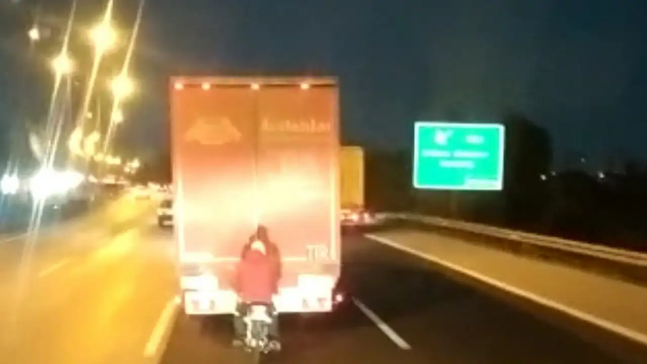 Hatay'da otobanı üzerinde bir tırın arka dorsesine asılan motosiklet sürücüsünün tehlikeli yolculuğu görüntülere yansıdı.