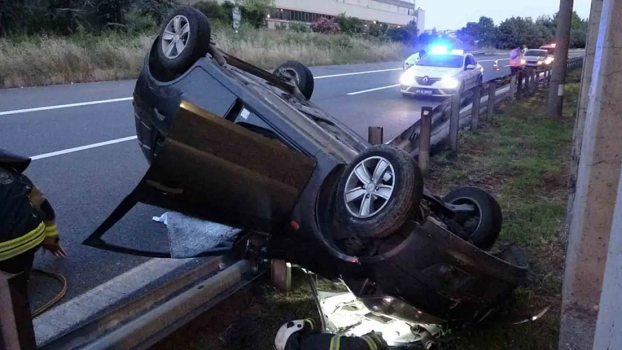 TEM Otoyolu Kocaeli geçişinde alkollü sürücünün kontrolünden çıkan otomobil bariyere çarpıp takla attı.