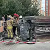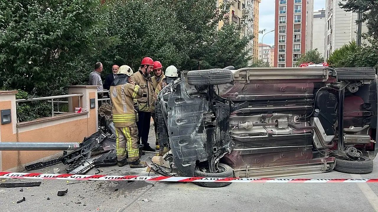 KADIKÖY'de içinde iki kişinin olduğu otomobil, ara sokakta çarptığı elektrik direğini yerinden söküp, yan yattı.