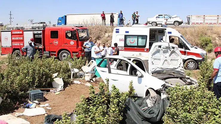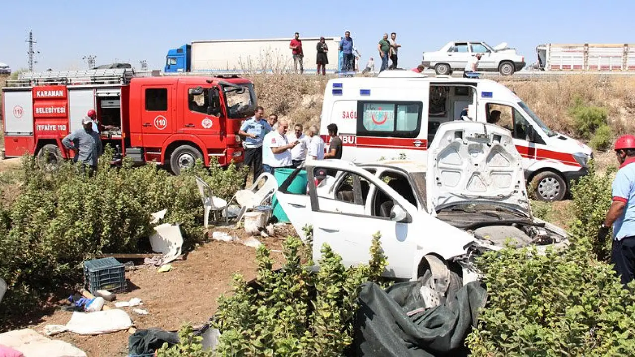 Kaza, Karaman-Konya karayolunun 10. kilometresinde meydana geldi. Alınan bilgiye göre, Abdullah A.(62), yönetimindeki 33 VLZ 32 plakalı otomobil, seyir halindeyken sürücünün direksiyon hakimiyetini kaybetmesi sonucu yoldan çıkarak elma fidanlığına uçtu. Kazada sürücü yaralanmazken, otomobilde yolcu olarak bulunan Fatma A. (55), Naciye T. (54) Mehmet Ali T. (66) Özge A. (4), ve Suna Ç. (9), yaralandı. Yaralılar olay yerine gelen ambulanslarla kaldırıldıkları Karaman Devlet Hastanesinde tedavi altına alındı. İtfaiye ise kaza yapan aracın yanma ihtimaline karşı akü bağlantılarını söktü.