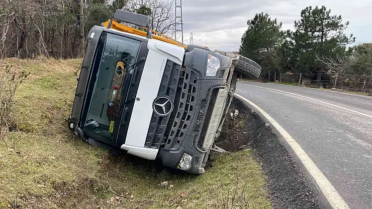 Sarıyer'de seyir halinde giden bir hafriyat kamyonu karşı yoldan gelen otomobilin hatalı sollaması nedeniyle devrildi.