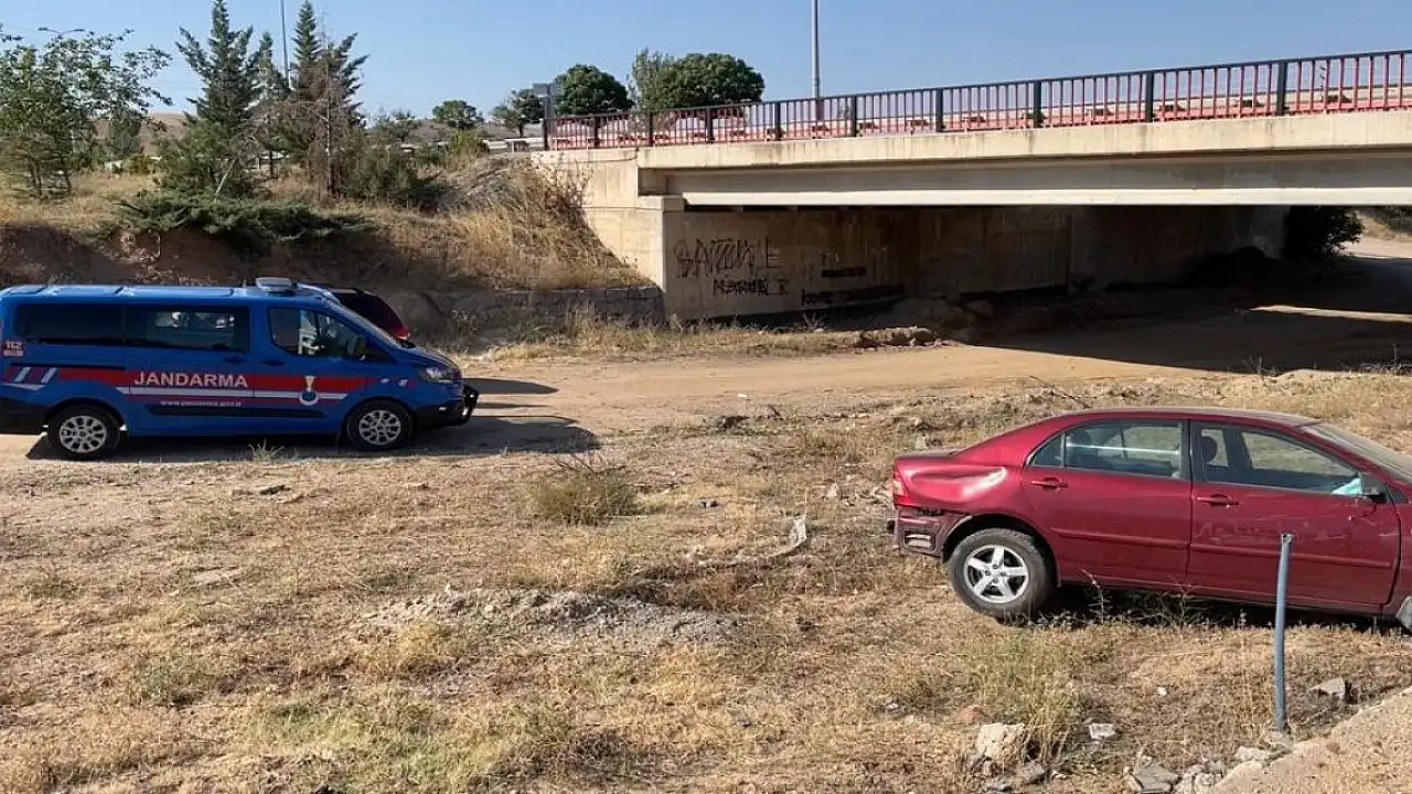 Kırıkkale'de, sürücüsünün kontrolünü kaybettiği otomobil, yol kenarındaki maket polis aracına çarpıp köprüden 4 metre aşağıdaki toprak yola uçtu.