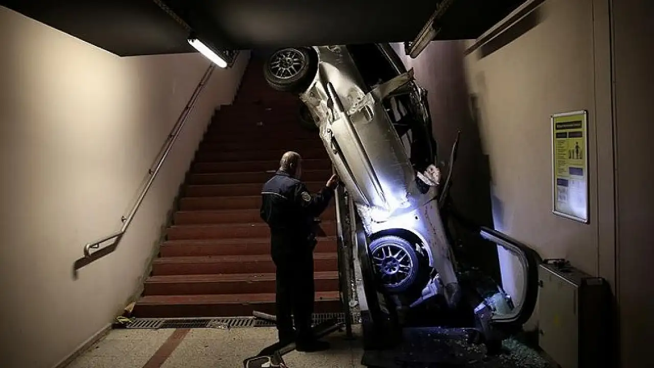 Otomobil metro yaya alt geçidine yuvarlandı