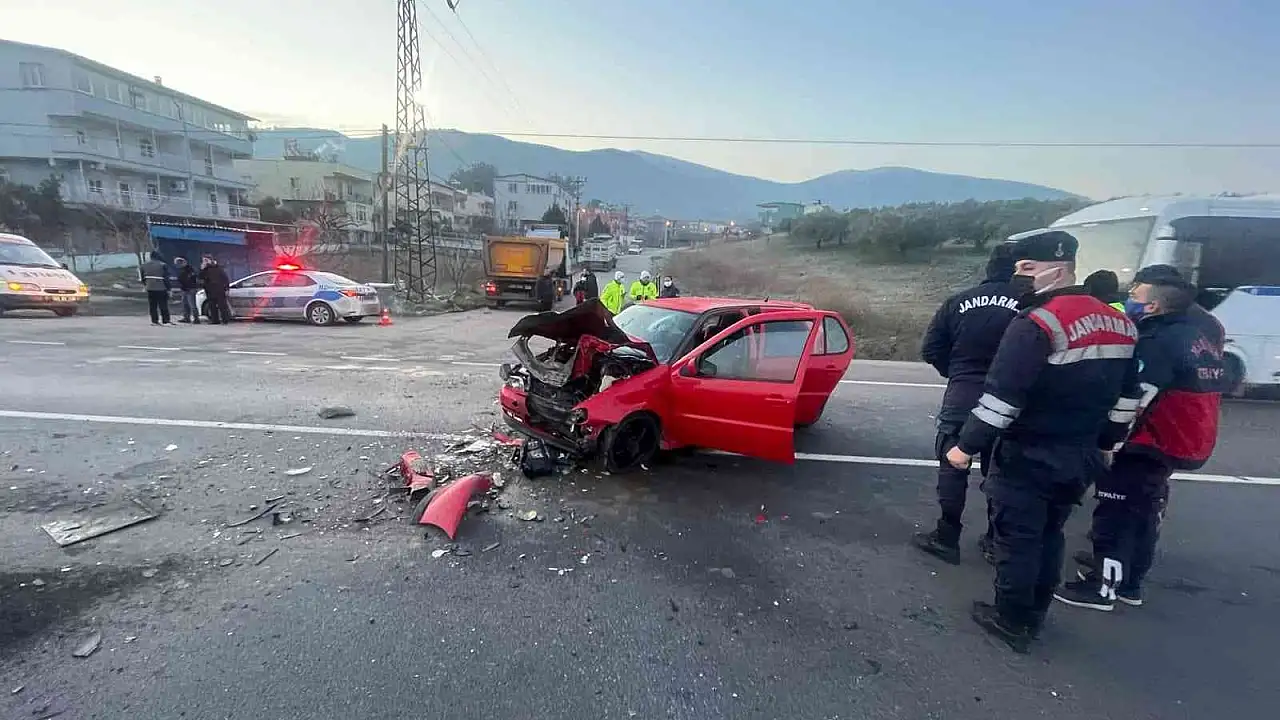 Manisa'nın Soma ilçesinde seyir halindeki bir otomobil, tali yoldan geri geri çıkan tıra çarptı.