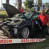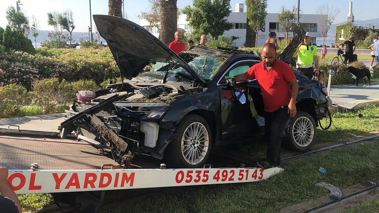 İZMİR'in Karşıyaka ilçesinde sürücüsünün direksiyon hakimiyetini kaybettiği otomobil bariyerlere vurup, savrulduğu tramvay yolu kenarındaki ağaca çarparak durdu.