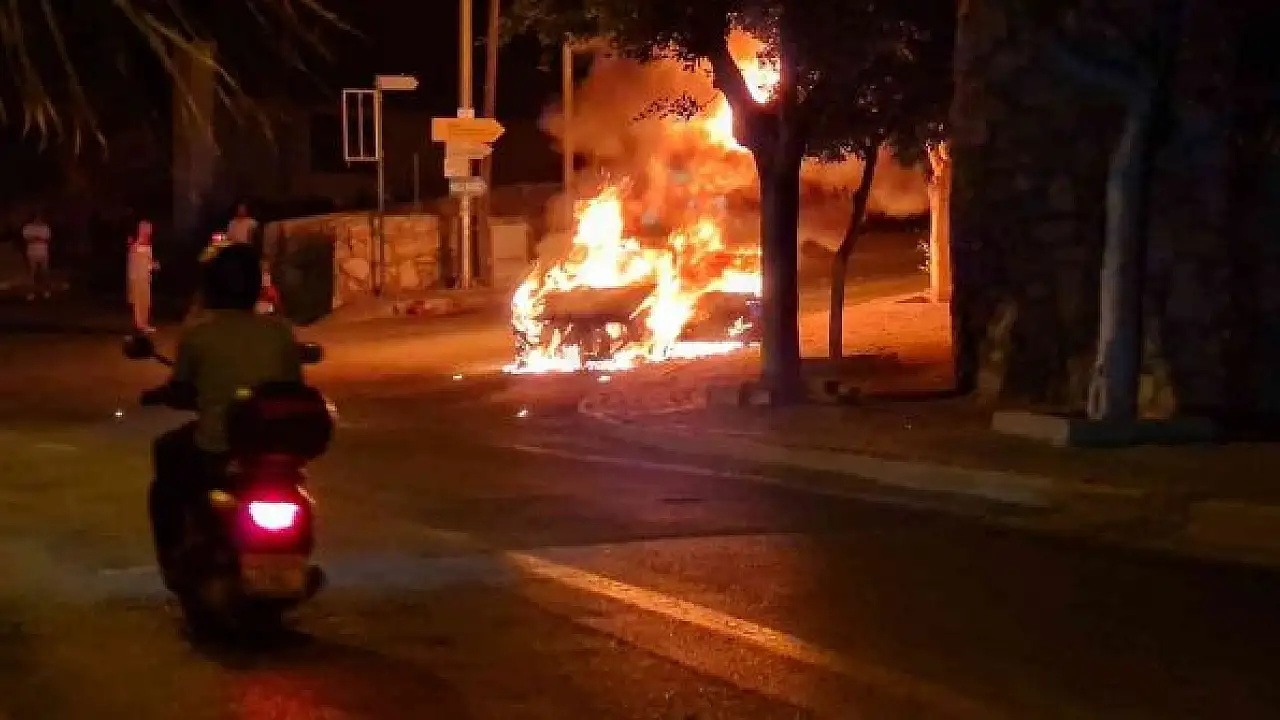 Muğla'nın Bodrum ilçesinde seyir halindeyken yanmaya başlayan otomobil alev topuna döndü. Zaman zaman patlamaların yaşandığı araç, tamamen yanarak kullanılamaz hale geldi.