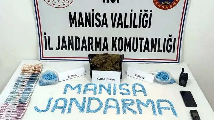 İzmir yolu Sabuncubeli mevkisinde uygulama yapan Manisa İl Jandarma Komutanlığı Kaçakçılık ve Organize Suçlarla Mücadele (KOM) Şube Müdürlüğü ve Yunusemre Jandarma Komutanlığı ekipleri, dün saat 23.00 sıralarında şüphe üzerine otomobili durdurdu. Araçta yapılan aramada 2 bin ecstasy hap ve 605 gram kubar esrar ile el telsizi, 2 cep telefonu, uyuşturucu ticaretinden elde edildiği değerlendirilen 4 bin TL ele geçirildi. Araçtaki Ü.P., gözaltına alındı. Şüphelinin jandarmadaki işlemlerinin sürdüğü öğrenildi.