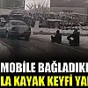 Otomobile bağladıkları bidonla kayak keyfi yaptılar