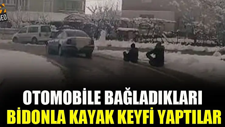 Konya'nın Beyşehir ilçesinde, günlerdir etkili olan kar yağışının ardından iki genç, tehlikeli olmasın rağmen bir otomobilin arkasına iple bağladıkları bidonla kayak keyfi yaptı.