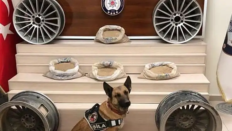 Narkotik köpeği "Şila"nın, otomobilin jantlarına tepki vermesi üzerine, aracın lastikleri jantlardan ayrıldı.