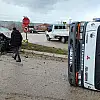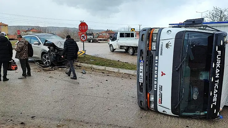 Otomobille çarpışan kamyon yan yattı