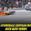 Otomobille çarpışan motosiklet alev alev yandı