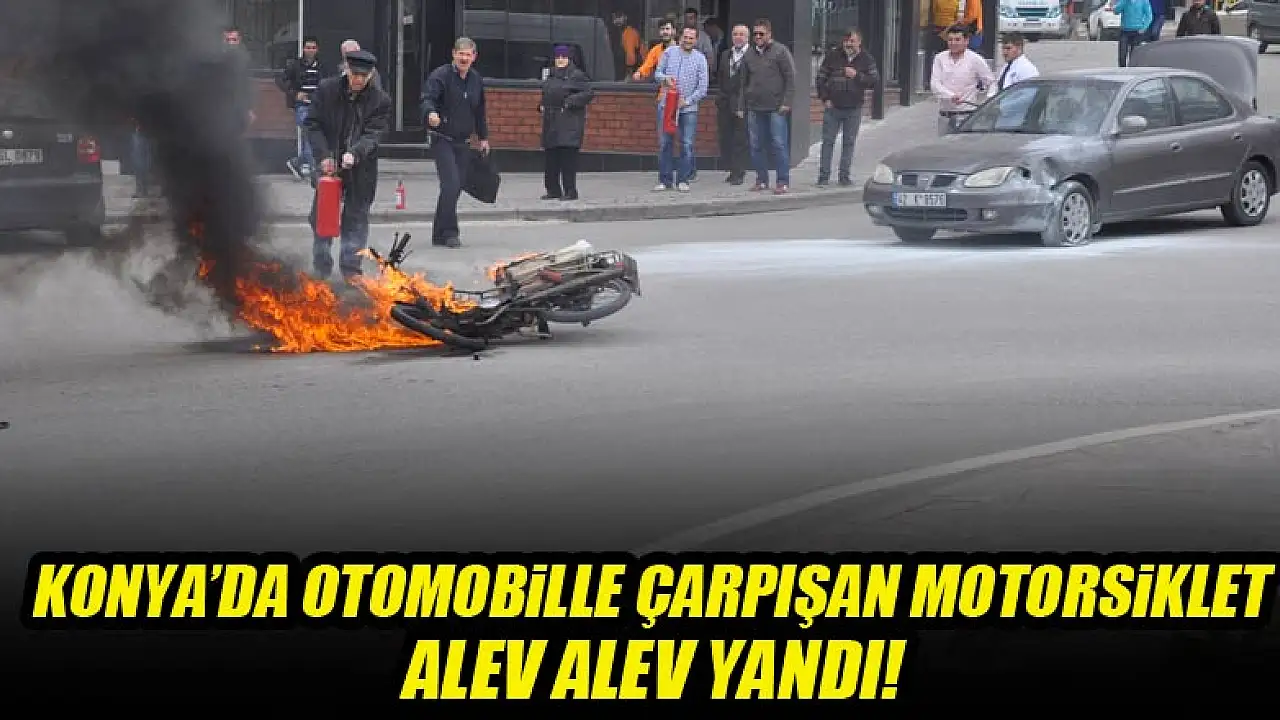Konya'nın Seydişehir ilçesinde otomobille çarpışan motosiklet kaza sonrası alev alev yandı.