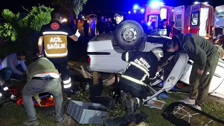 DÜZCE'de, üniversite öğrencilerinin otostop yaparak bindikleri otomobilin refüjdeki ağaç ve elektrik direğine çarparak takla attığı kazada 5 kişi yaralandı.