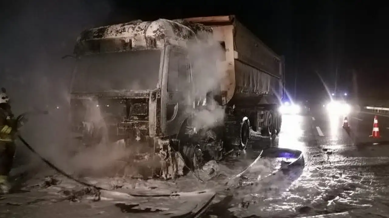 HATAY'ın Erzin ilçesinde hareket halindeyken alev alan TIR, ihbar üzerine gelen itfaiye ekiplerinin müdahalesiyle söndürüldü.