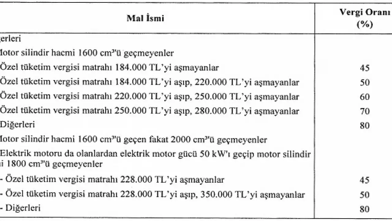 Kararla, motor silindir hacmi 1600 CC altındaki araçlarda matrah alt limiti 120 bin liradan 184 bin liraya yükseltildi. Matrah üst limiti ise 200 bin liradan 280 bin liraya çıkarıldı. Kararla elektrikli araçların ÖTV matrah limitleri de değişti. Buna göre, motor gücü 50 kilowaatı geçip, motor silindir hacmi 1800 CC'yi geçmeyen araçlarda matrah alt limiti 130 bin liradan 228 bin liraya yükseltildi. Matrah üst limiti ise 170 bin liradan 350 bine çıkarıldı.