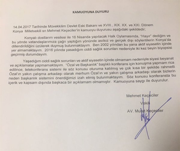 “Konyalı dostlarım vesilesi ile 16 Nisan’da yapılacak Halkoylamasında 'Hayır' dediğim ve bu yönde vatandaşlarımıza çağrı yaptığım yönünde asılsız ve gerçek dışı söylentilerin Konya’da dillendirildiğini üzülerek duymuş bulunmaktayım. Ben 2002 yılından buyana aktif siyasetin içinde yer almamaktayım. 2016 yılında yaşadığım ciddi sağlık sorunları nedeniyle iki kez beyin biyopsisi geçirmiş durumdayım.