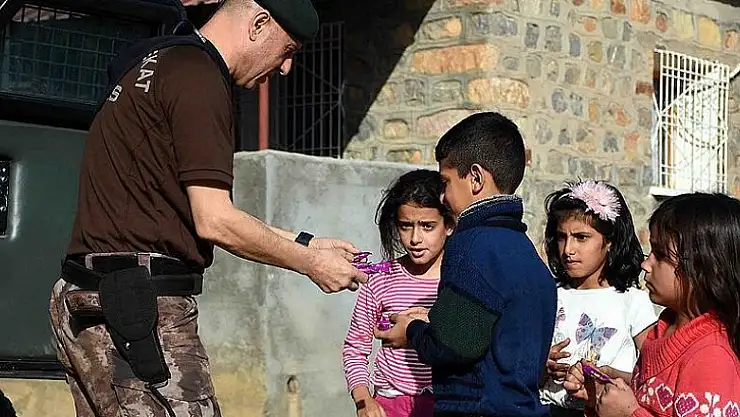 Diyarbakır'ın Hazro ilçesinde görev yapan özel harekat polisleri devriye gezerken karşılaştıkları çocuklara özel ilgi gösteriyor.
