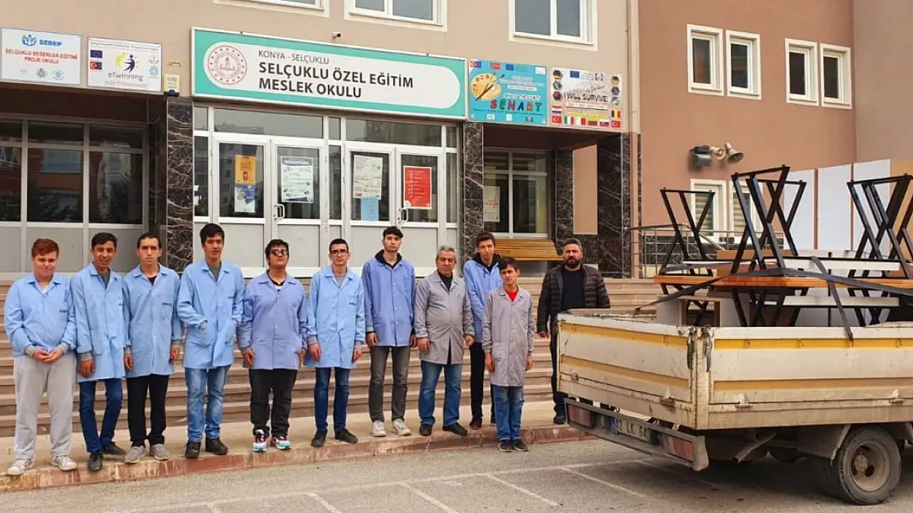 Mobilya ve Teknoloji Bölümü öğrencileri, sınıf dolabı, bireysel öğrenci dolabı, oyuncak dolabı, öğrenci masa ve sıraları, öğretmen dolabı, dosya dolabı ve kalorifer gizlemesini, öğretmenlerinin yönlendirmeleri eşliğinde azim, gayret ve mutluluk içerisinde üreterek diğer okuldaki arkadaşları için hazırlayıp hizmete sundu. Selçuklu Özel Eğitim Meslek Okulu, böylece hem üretime katkı sağlamış hem de özel çocukların eğitim ortamlarında ihtiyaç duydukları donanımı yine özel çocukların elinden üretmiş oldu. Türkiye genelinde öğretimini sürdüren özel eğitim meslek okulları ile özel eğitim ihtiyacı olan öğrencilere istihdam öncesi mesleki beceriler kazandırılması amaçlanırken, bu yönde meslek edinme atölyelerinde ve işletmelerde uygulamalı olarak çalışmalar düzenleniyor. •AA
