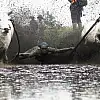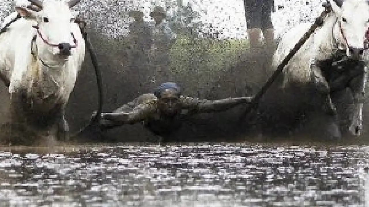 Hasat sezonunun bitişini kutlamak için çamurlu pirinç tarlalarında yapılan boğa yarışları ilginç görüntülere sahne oldu.