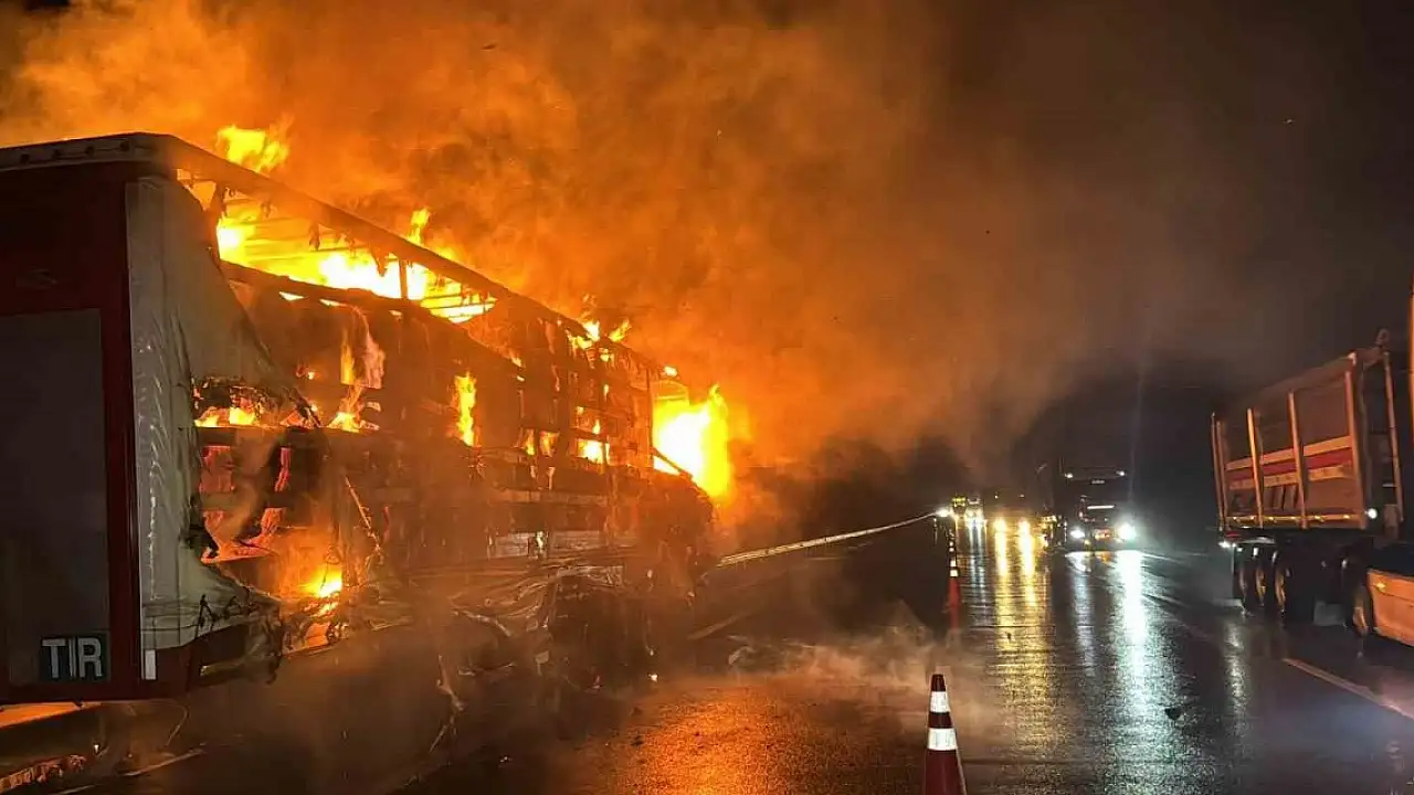 Yangın itfaiye ekiplerinin 1.5 saatlik çalışması sonrası söndürüldü. Tek şeritten verilen yol ili şeride çıkarılırken tırın kaldırma çalışmaları sabah saatlerinde yapılacak.