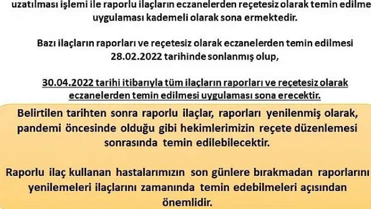 Samsun Eczacı Odası Başkanı Onur Ferhat Karacan, pandemi nedeniyle başlatılan ilaç raporlarının otomatik olarak uzatılması işlemi ile raporlu ilaçların eczanelerden reçetesiz olarak temin edilmesi uygulamasının 30 Nisan itibarıyla sona ereceğini açıkladı.