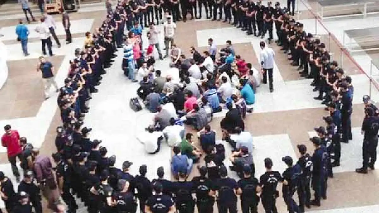 Tam bu sırada avukatlar şüphelilerin yanına giderek ‘gözaltı süreniz bitti serbestsiniz’ dedi. Bunun üzerine tüm şüpheliler adliyeden ayrılmak üzere 6. kattan -3. kata indi. Burada önleri kesilen şüpheliler bir saat boyunca oturma eylemi yaparak şov yaptı. Paralel medya organları da adliye içinde görüntü alınmasının yasak olmasına rağmen canlı yayın yaptı. Mahkemenin müdahalesi ile şüpheliler tekrar nezarete alındı. Ancak bu sefer de Yurt Atayün başta olmak üzere şüpheliler ifade vermeyi reddederek süreci uzattı. Geç saatlere kadar devam eden kriz şüphelilerin teker teker hakim karşına çıkarılması ile sorguya tekrar başlandı.