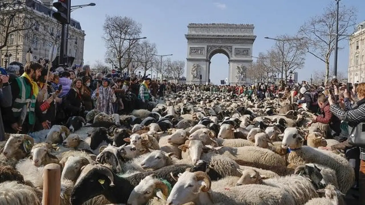 Paris'te düzenlenen 58. Tarım Fuarı'nın kapanışı dolayısıyla ülkenin önemli hayvancılık merkezlerinden Pyrenees-Atlantiques bölgesindeki Bearn kentinden gelen çiftçiler 2022 koyunun yanı sıra çoban köpekleri, çok sayıda büyükbaş hayvan ve atla Zafer Takı'na doğru yürüdü.