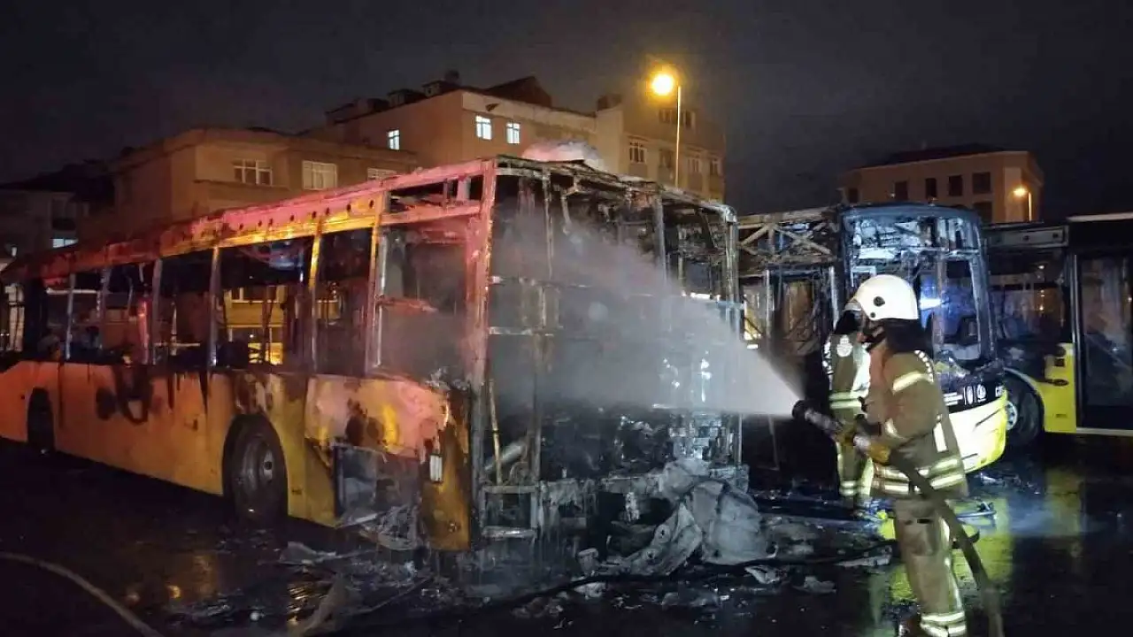 İtfaiye ekiplerinin 1 saatlik çalışmasının ardından yangın kontrol altına alınırken otobüsler kullanılamaz hale geldi.