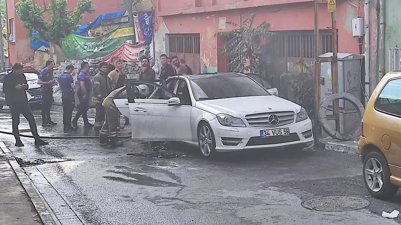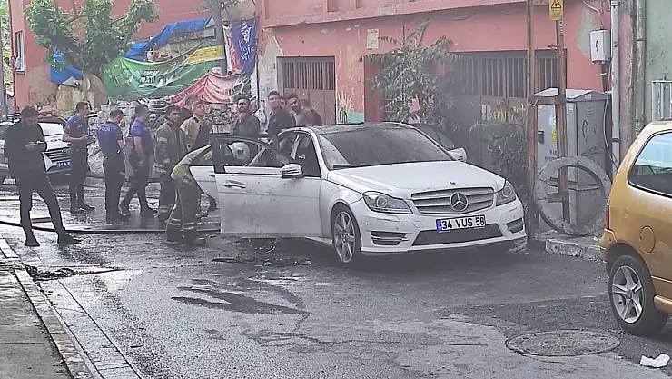 BEYOĞLU'nda park halindeki otomobil henüz belirlenemeyen bir nedenle alev alev yandı. Yangına ilk müdahaleyi otomobilin sahibi yaparken o anlar cep telefonu kamerasına yansıdı.