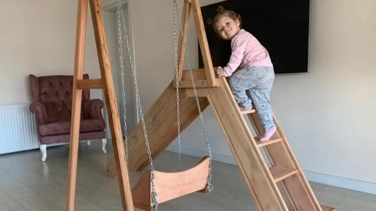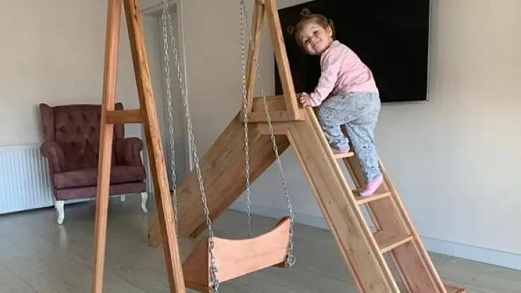 Rize'de yaşayan Mustafa Türk, evde sıkılan ancak Kovid-19 salgını nedeniyle parka götüremediği torunu için atölyesinde yaptığı ahşap salıncak ve kaydırağı evin salonuna kurdu.