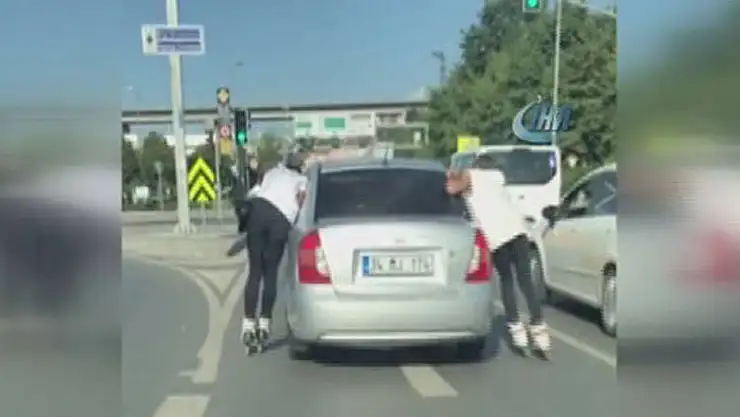 İstanbul'da, seyir halindeki otomobile tutunarak ilerleyen 2 gencin tehlikeli oyunu yürekleri ağza getirdi. Araçta bulunan bir bayan ise tehlikeli yolculukta patenci gençler ile birlikte öz çekim yaptı.