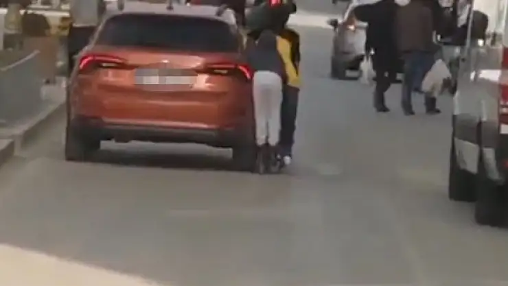 Van'ın İpekyolu ilçesinde seyir halindeki bir otomobile asılan patenli 3 çocuğun tehlikeli yolculuğu cep telefonu kamerasıyla kaydedildi.