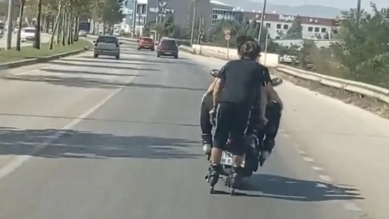 Bursa'da patenli genç anayolda motosiklete tutunarak ilerledi. O anlar trafikteki başka bir sürücünün cep telefon kamerasına yansıdı.
