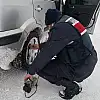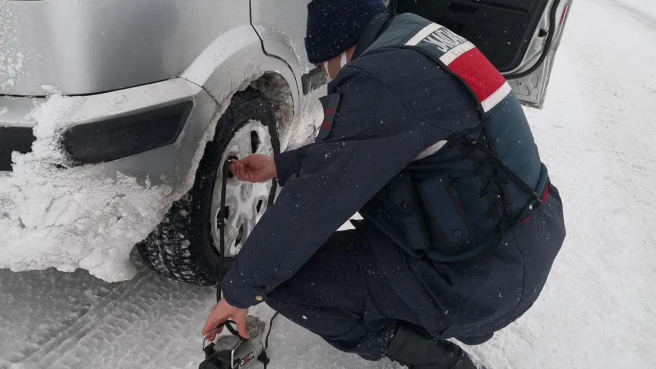 Aksaray'da yoğun kar ve tipi nedeniyle yolda otomobilinin lastiği patlayan sürücüye jandarma yardımcı oldu. Jandarma personeli araçta bulunan teçhizatla sürücünün patlayan lastiğini onardı.