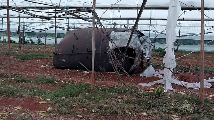 Antalya'nın Aksu ilçesindeki palet fabrikasında meydana gelen patlamada, iş yerinden fırlayan kazan, yaklaşık 300 metre uzaktaki seranın içerisine düştü. Şans eseri ölen ya da yaralananın olmadığı patlamada fabrika, sera ve çevredeki araçlarda maddi hasar meydana geldi.
