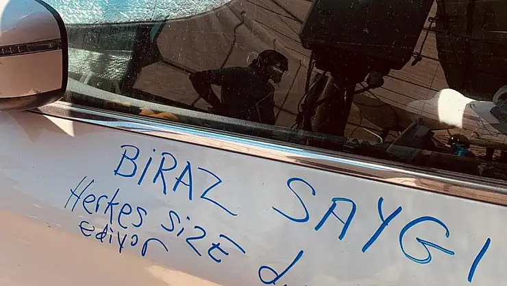 Muğla'nın Datça ilçesinde, önemli turizm merkezlerinden Palamutbükü'nde, bir sürücünün otomobilini pazar yerinin girişine park etmesi tepki çekti. Vatandaşlardan biri, aracın kaportasına keçeli kalemle "Biraz saygı. Herkes size dua ediyor" yazarken, başka biri ise not bıraktı.