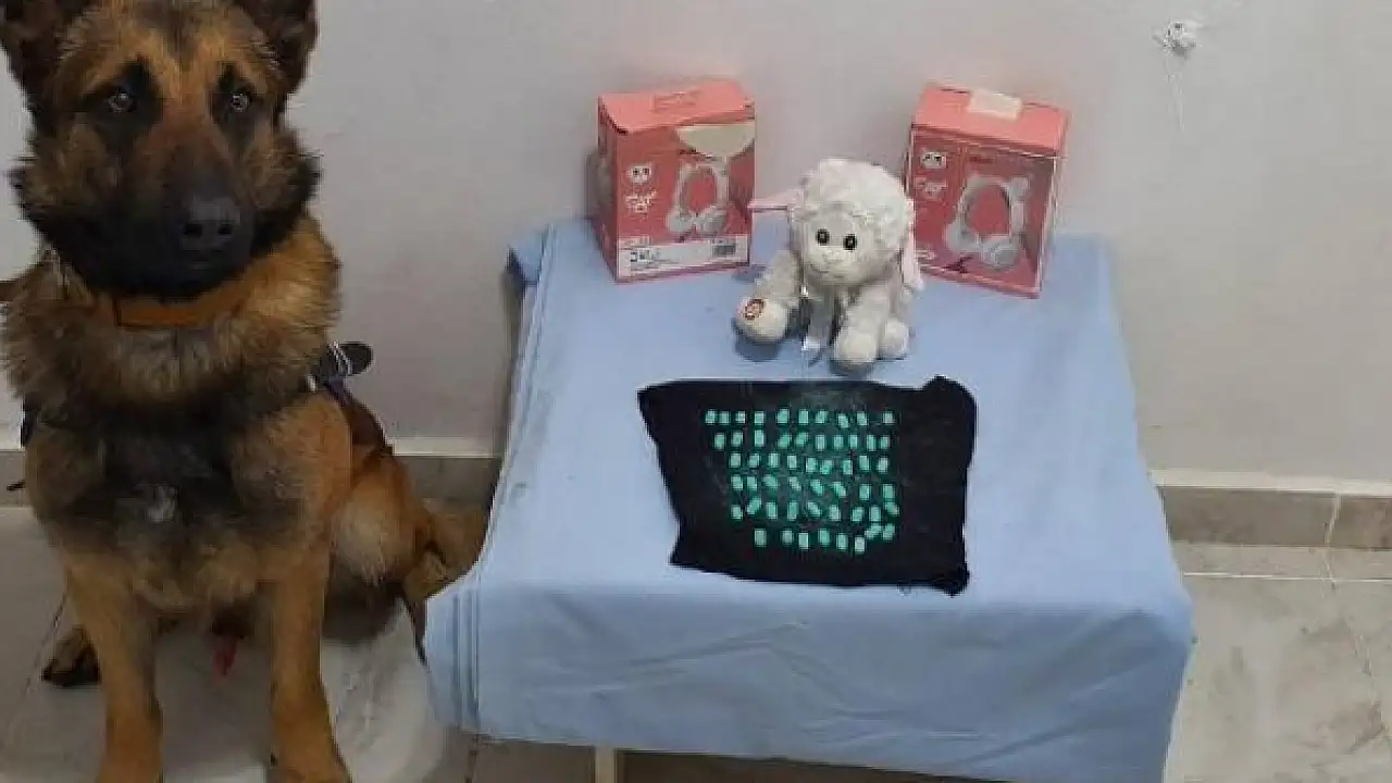Narkotik köpeğinin tepki vermesi üzerine bir valizde yapılan detaylı aramada, peluş oyuncağa gizlenmiş 60 uyuşturucu hap ele geçirildi.