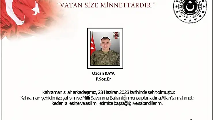 "Pençe operasyonu bölgesinde 15 Haziran'da teröristlerce yapılan taciz atışı sonucunda yaralanarak hastaneye sevk edilen kahraman silah arkadaşımız Piyade Sözleşmeli Er Özcan Kaya, tedavi gördüğü hastanede yapılan tüm müdahalelere rağmen kurtarılamayarak bugün şehit olmuştur.