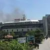 İş merkezinin çatısından yükselen dumanlar drone ile havadan görüntülenirken yangın nedeniyle iş merkezinin içerisi de dumanlarla kaplandı.
