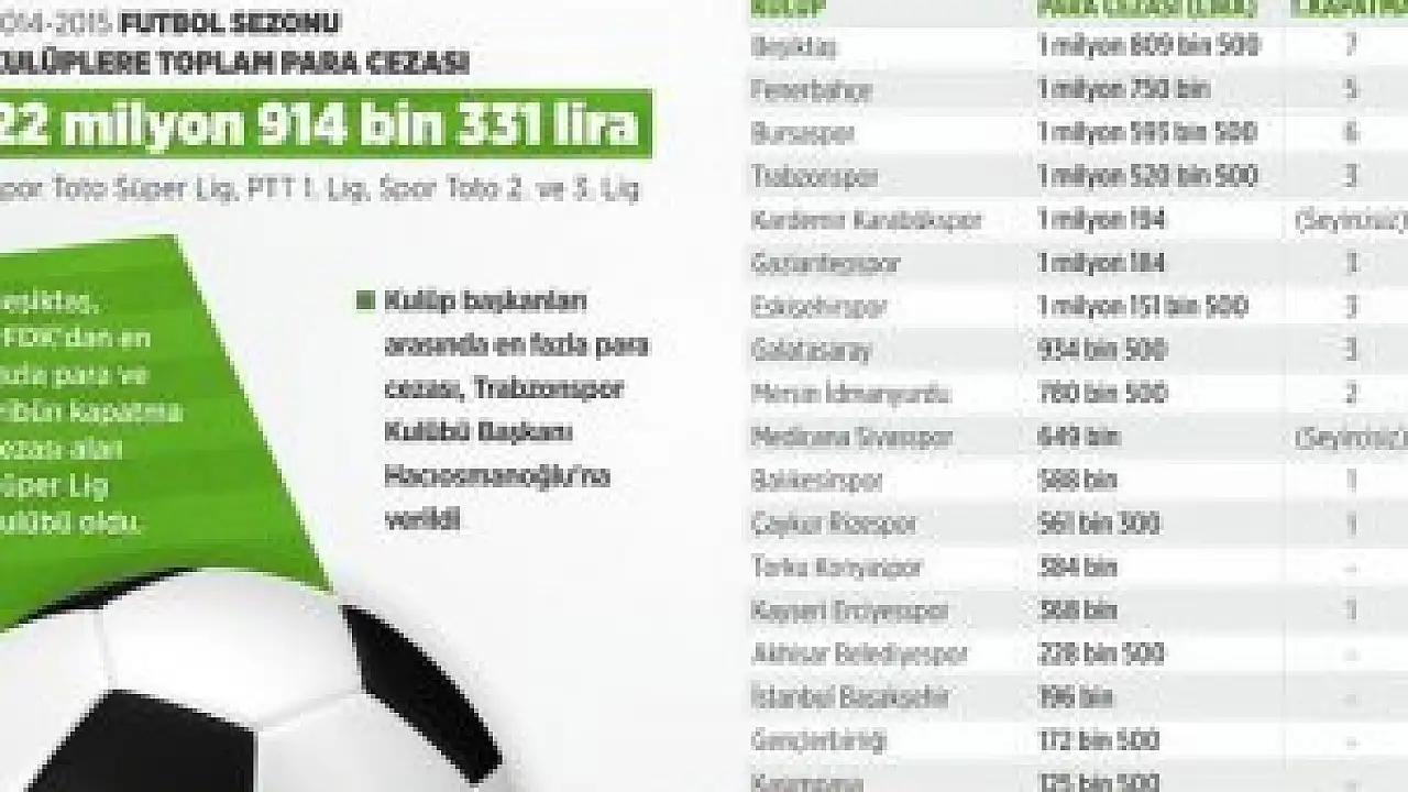 PFDK, 2014-2015 sezonunda Spor Toto Süper Lig, PTT 1. Lig, Spor Toto 2. ve 3. Lig'de yer alan kulüplere toplam 22 milyon 914 bin 331 lira para cezası verdi.